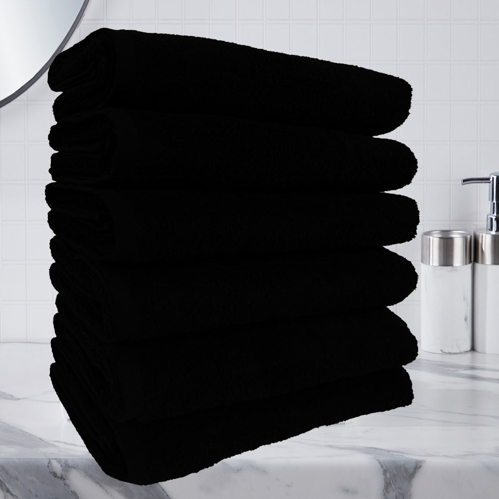 Siyah vücut havlusu, %100 pamuk dokusuyla, 400 gr ağırlığında ve 410 GSM yoğunluğunda üretilmiştir.